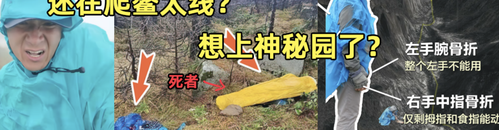 去年10月,知名洞潛區(qū)、臨時(shí)起意區(qū)、攪動(dòng)泥沙區(qū)、傳來(lái)噩耗區(qū)博主“神秘園”,發(fā)布了他的第一期鰲太線戶外事故視頻——53歲的吳先生和兩名同伴一起繞過(guò)檢查點(diǎn),僅帶了極少量物資就非法速穿鰲太線,結(jié)果先是進(jìn)度落后物資告罄,又是在下撤途中突然腿部抽筋,隊(duì)友跑去尋求救援。